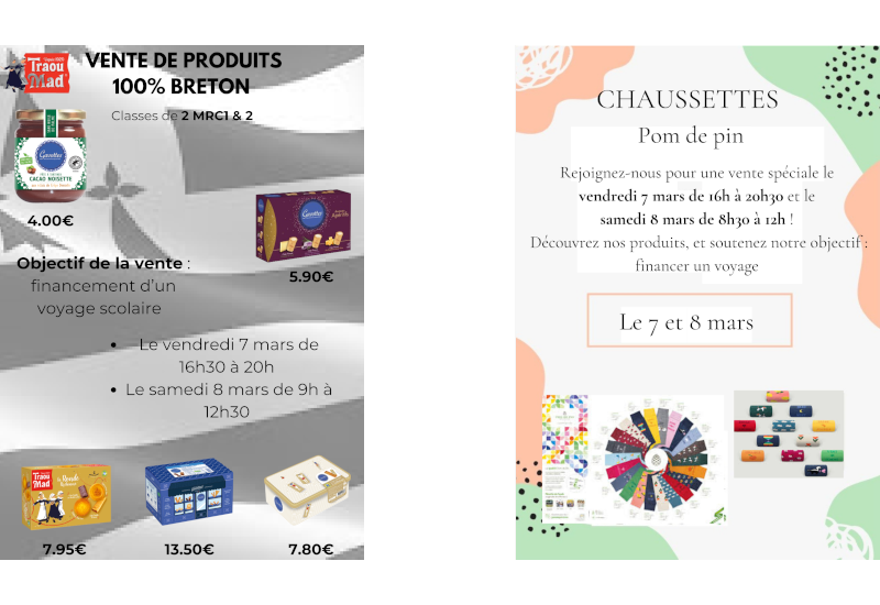 Les 2des MRC, quant à elles, pour financer un voyage scolaire, vous proposeront la vente de produits Traou Mad tels que des gavottes ainsi que des chaussettes Pom de pin made in France en laine ou en coton pour enfants et pour adultes. Vous pourrez venir les voir sur leur stand en salle N041.