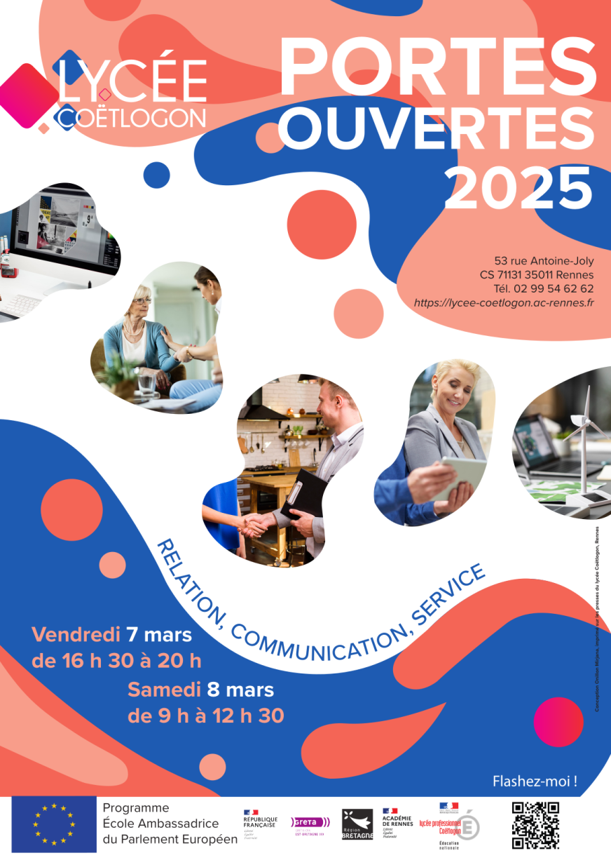 N.B. : Dans le cadre des Journées Portes ouvertes 2024, les élèves de 2de MRC avaient réalisé des pastilles vidéo et des affiches, pour présenter le lycée, les formations, le foyer, les activités sportives et culturelles mais aussi pour vous proposer des arguments qui pourraient vous convaincre de poursuivre votre scolarité au Lycée professionnel Coëtlogon ; elles sont accessibles depuis la page suivante.