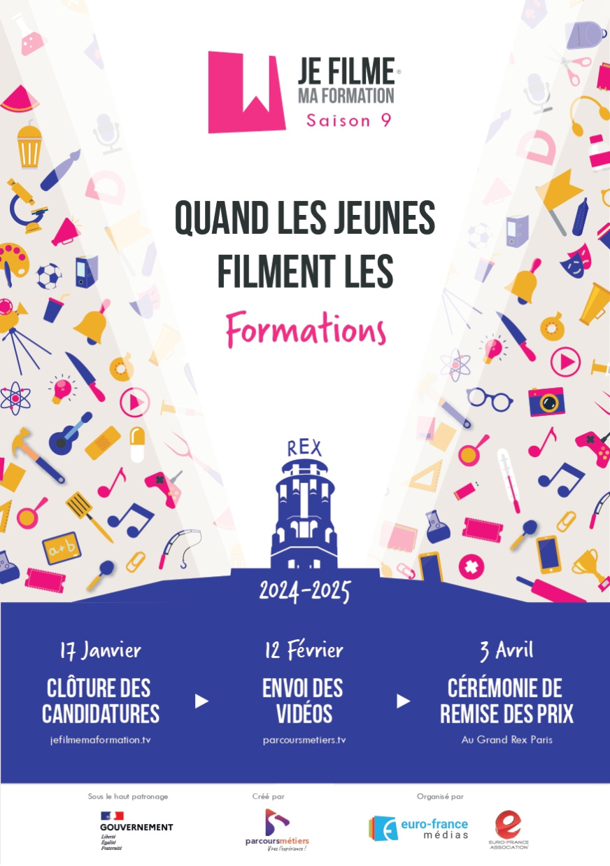 Sous le haut patronage du Ministère de l’Éducation nationale, du Ministère de l’Enseignement supérieur et du Ministère du Travail, parrainé par des noms prestigieux, soutenu par des partenaires économiques engagés, Je filme ma formation est une occasion unique pour les établissements, leurs enseignants et leurs élèves, de faire découvrir les formations qu’ils dispensent et/ou reçoivent. Le concours, gratuit, est ouvert à tous les établissements publics ou privés du CAP aux Grandes Écoles.