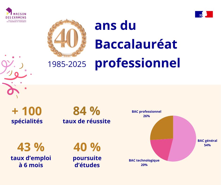 Depuis 40 ans et après quelques réformes, le BAC pro a trouvé sa place parmi les 3 baccalauréats : aujourd’hui, plus d’1 bachelier sur 4 est détenteur d’un baccalauréat professionnel.