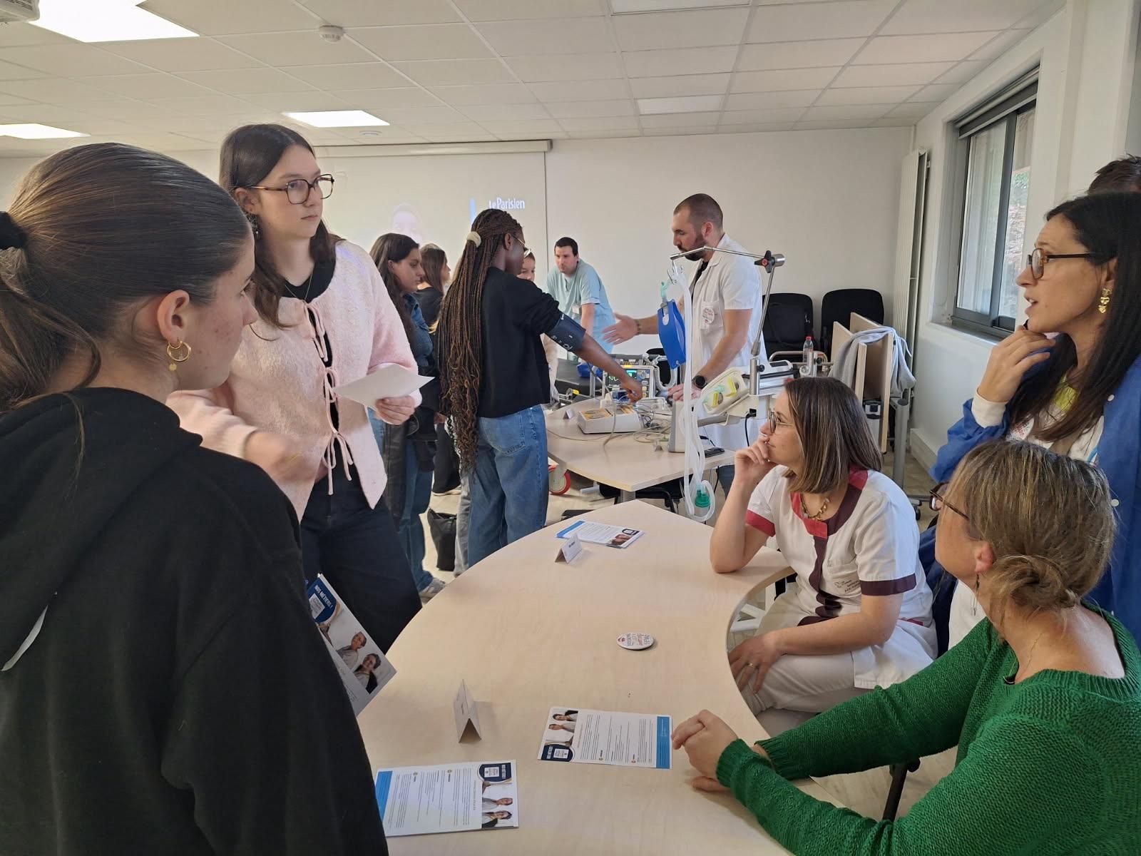 Un temps fort de la journée a été consacré à un forum des métiers, permettant aux élèves d’échanger avec de nombreux professionnels : infirmiers diplômés d’État, aides-soignants, brancardiers, techniciens biomédicaux, enseignants en activité physique adaptée, auxiliaires de puériculture, manipulateurs en électroradiologie, secrétaires médicales et personnels administratifs. Des fiches métiers ont été mises à leur disposition afin d’enrichir leur réflexion sur leur orientation professionnelle.