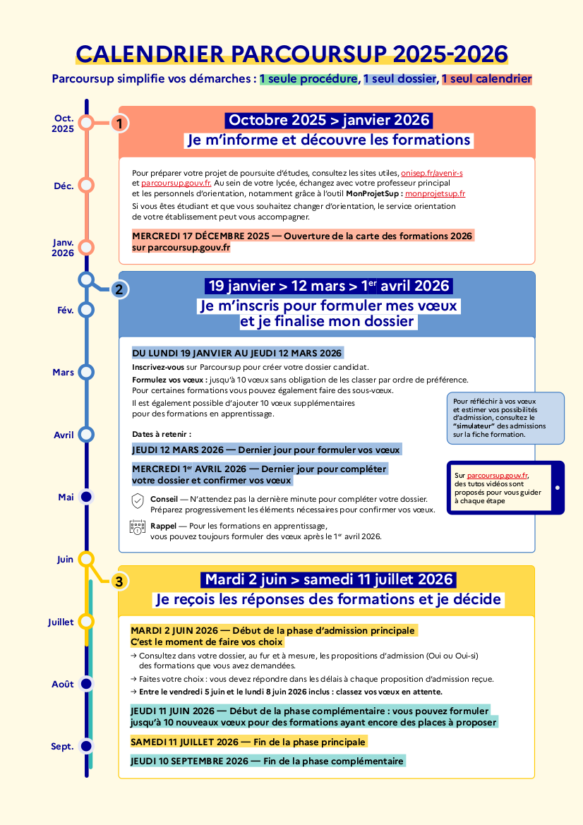 - Étape 2, du 19 janvier au 12 mars et jusqu’au 1 avril 2026, je m’inscris pour formuler mes vœux et je finalise mon dossier ;